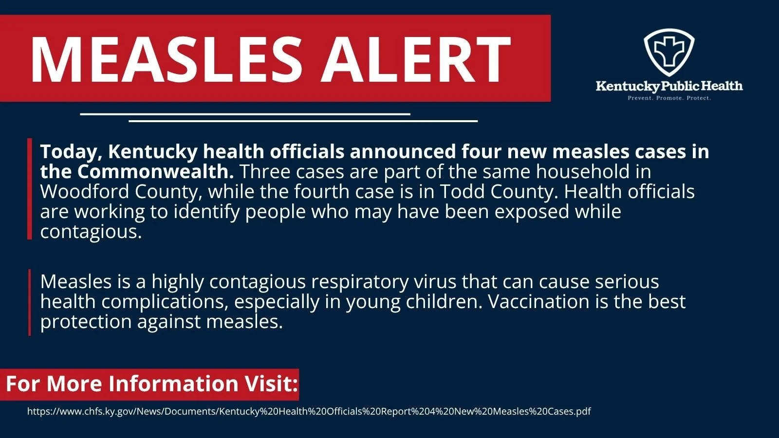 Kentucky health officials announced four new measles cases in the Commonwealth. Three cases are part of the same household in Woodford County, while the fourth case is in Todd County.